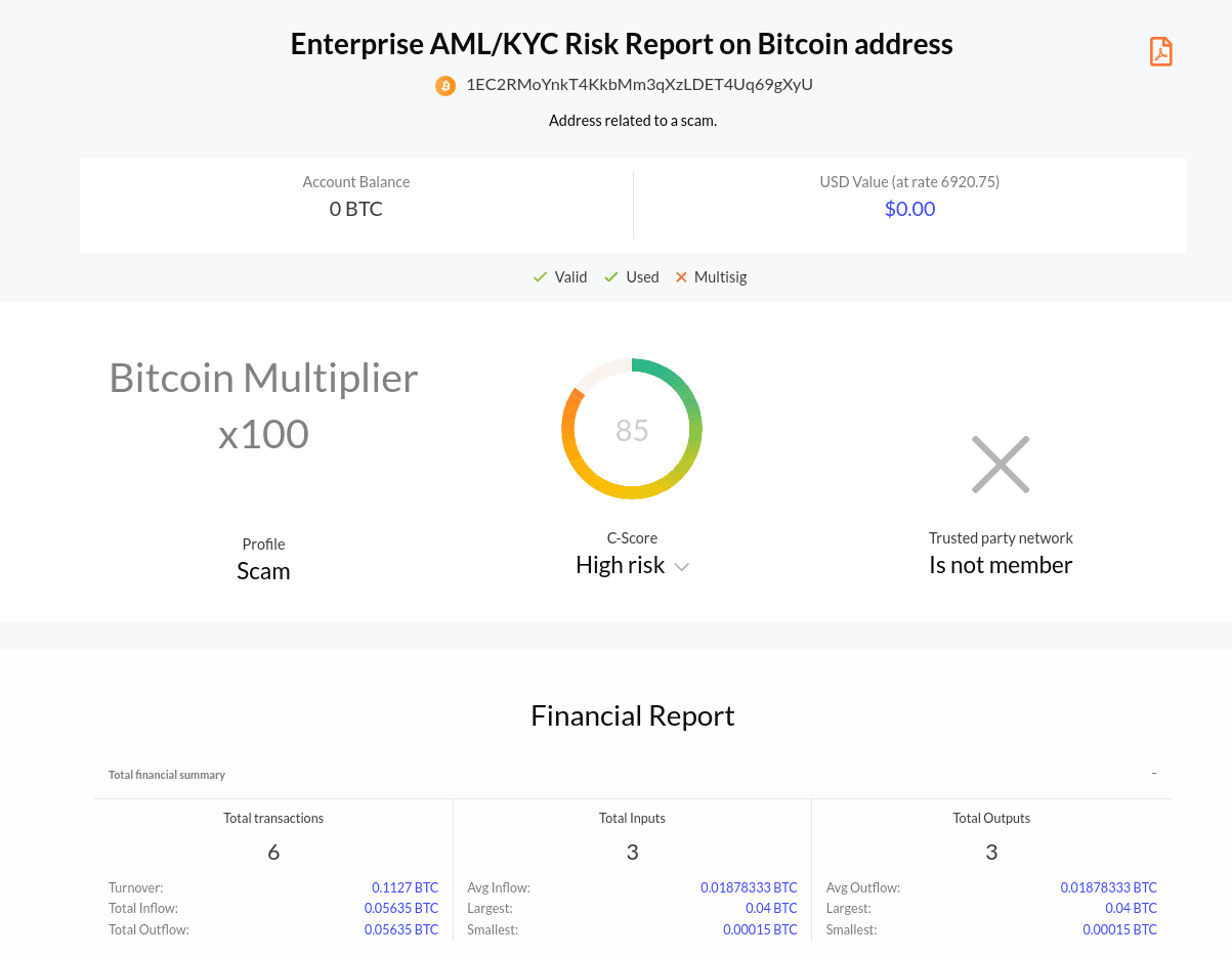 These Bitcoin Multipliers highlight another of the countless potential ways that cryptocurrency users around the world can use the AMLT Network to help prevent these sort of actors from reaping the spoils of their dishonest work. So how did we confirm this one was in fact fraud? Below we show you how this process works and what is the end result through a Coinfirm AML Risk Report.