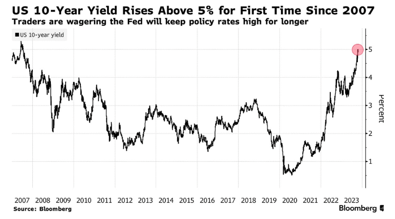 Interest rates and bond prices are inversely correlated so it is likely that bonds will continue underperforming if rates stay higher for longer as widely expected. This makes Fink’s strategy of cutting exposure to bonds an ideal way for investors to minimize losses and free more capital for investments in growth assets that could deliver better returns. Tellingly, the US 10-year yield recently rose above 5% for the first time since 2007, indicating that the ongoing sell-off in treasury bonds is yet to slow down.