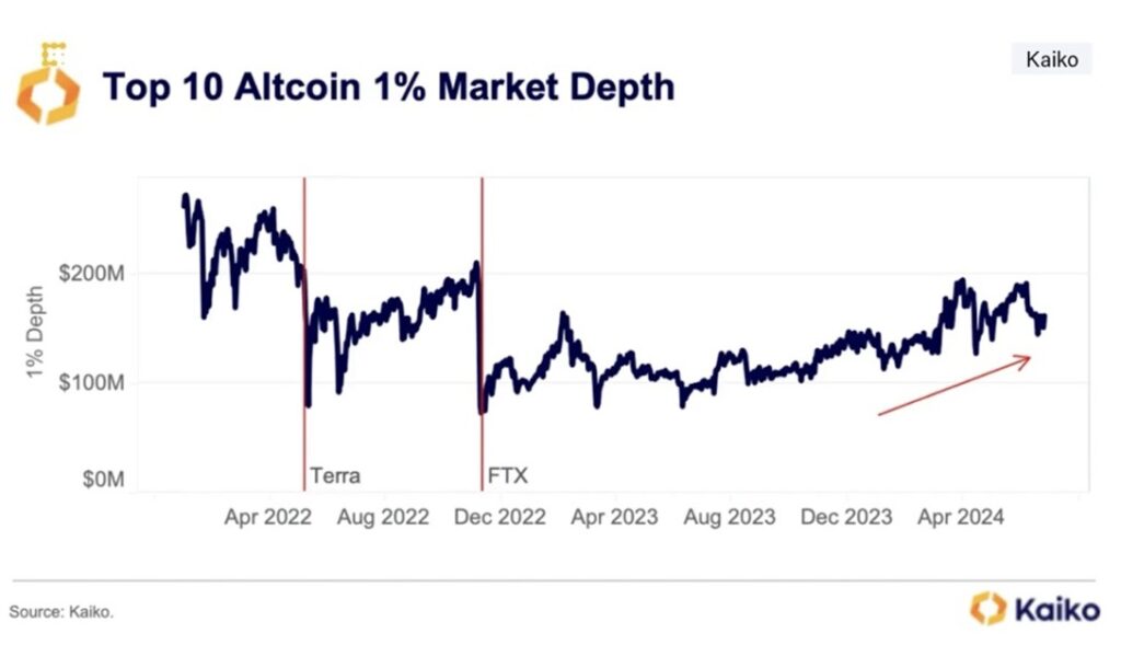 The liquidity situation in the altcoin market has shown mixed signals. While some altcoins have underperformed, overall liquidity in the market has seen significant improvement in 2024. According to data from Kaiko, the aggregated 1% depth for the top ten altcoins by market cap is about $162 million, which has gone up by 38% compared to last year’s average.