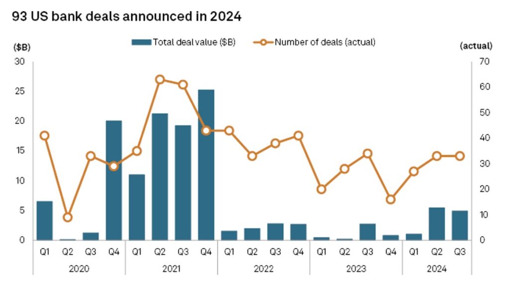 To remain relevant and enhance competitiveness, regional banks are merging. In 2023, U.S. bank mergers experienced a significant decline, with total deal value reaching approximately $4.21 billion — the lowest since 2009 — according to S&P Global Market Intelligence. However, there is an anticipated rebound in 2024, with 93 U.S. bank deals worth an aggregate of $11.42 billion announced through September 30, 2024.