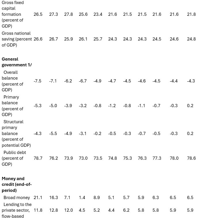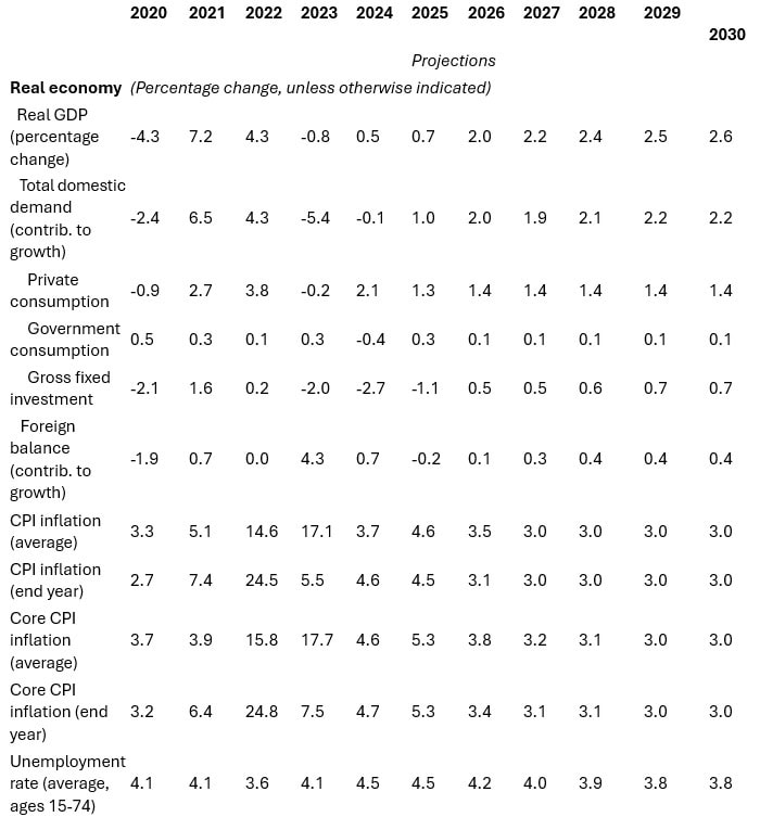 High domestic and external uncertainty are expected to continue weighing on the outlook. Modest consumption-driven growth of 0.7 percent is expected in 2025 underpinned by favorable wage dynamics. Growth is projected at 2 percent in 2026 on a recovery in investment and a positive impulse from German fiscal expansion. Inflation is expected at 4.5 percent in Q4:2025 and then to gradually decelerate to the central bank’s 3 percent target by 2027. Under current policies, the fiscal deficit will remain around 4½ percent of GDP through the medium term, with debt-to-GDP rising to around 79 percent by 2030.