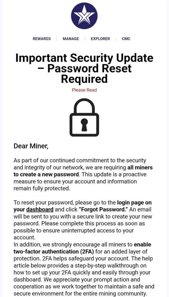 TEXITcoin miners were reportedly all told to change their passwords. Disruption Banking obtained an image of an email from a Facebook group for TEXITcoin miners, one of whom received the email and was advising all other miners to reset their passwords.