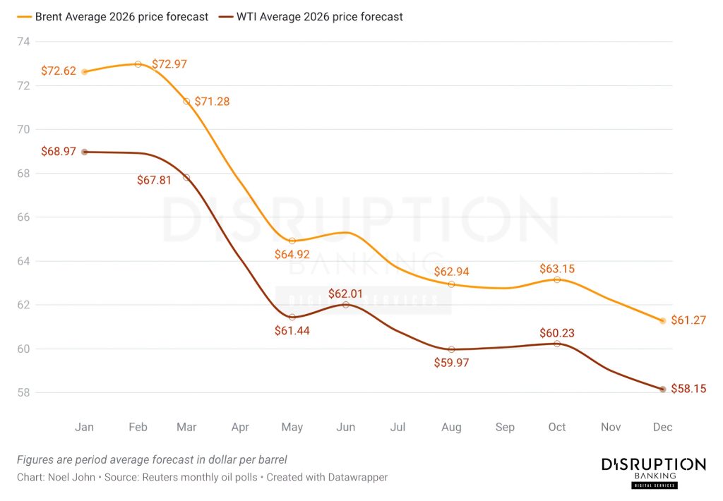 Oil continues to dominate Saudi revenues and influence forex stability. Forecasts indicate global crude prices will soften in 2026, with a Reuters poll from December 2025 projecting Brent at an average of $61.27 per barrel, and some analysts predicting mid-$50s in certain periods. Brent prices declined by about 20% over 2025, straining budgets and prompting increased borrowing.