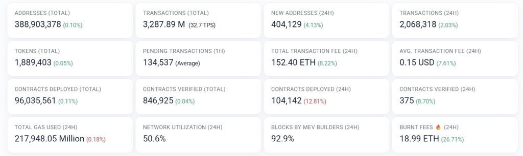 Ethereum, the world’s second-largest blockchain by market cap, remains the leading platform for smart contracts and DeFi. Its daily transactions are above 2 million (~23 transactions/sec), drawn from more than 400 million unique addresses. Average gas fees are low (roughly $0.10–$0.20 as of early 2026), and throughput is only about 50% utilized.
