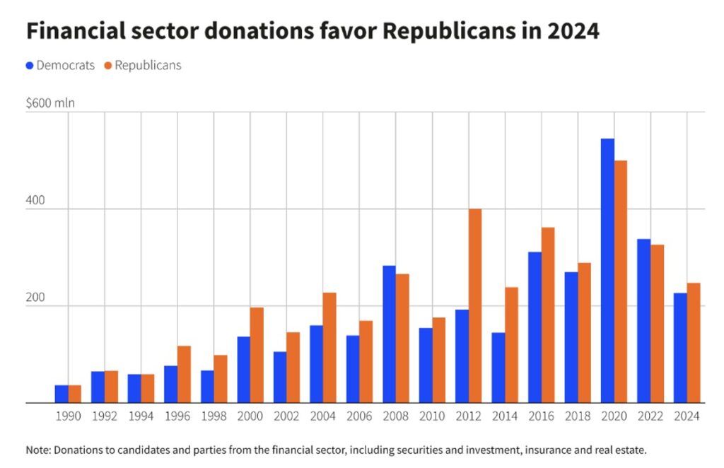 According to data recently crunched by OpenSecrets, the financial sector, which includes securities and investment, insurance and real estate industries, has donated $247 million to Republican candidates in the current two-year political cycle, versus $227 million to Democrats.